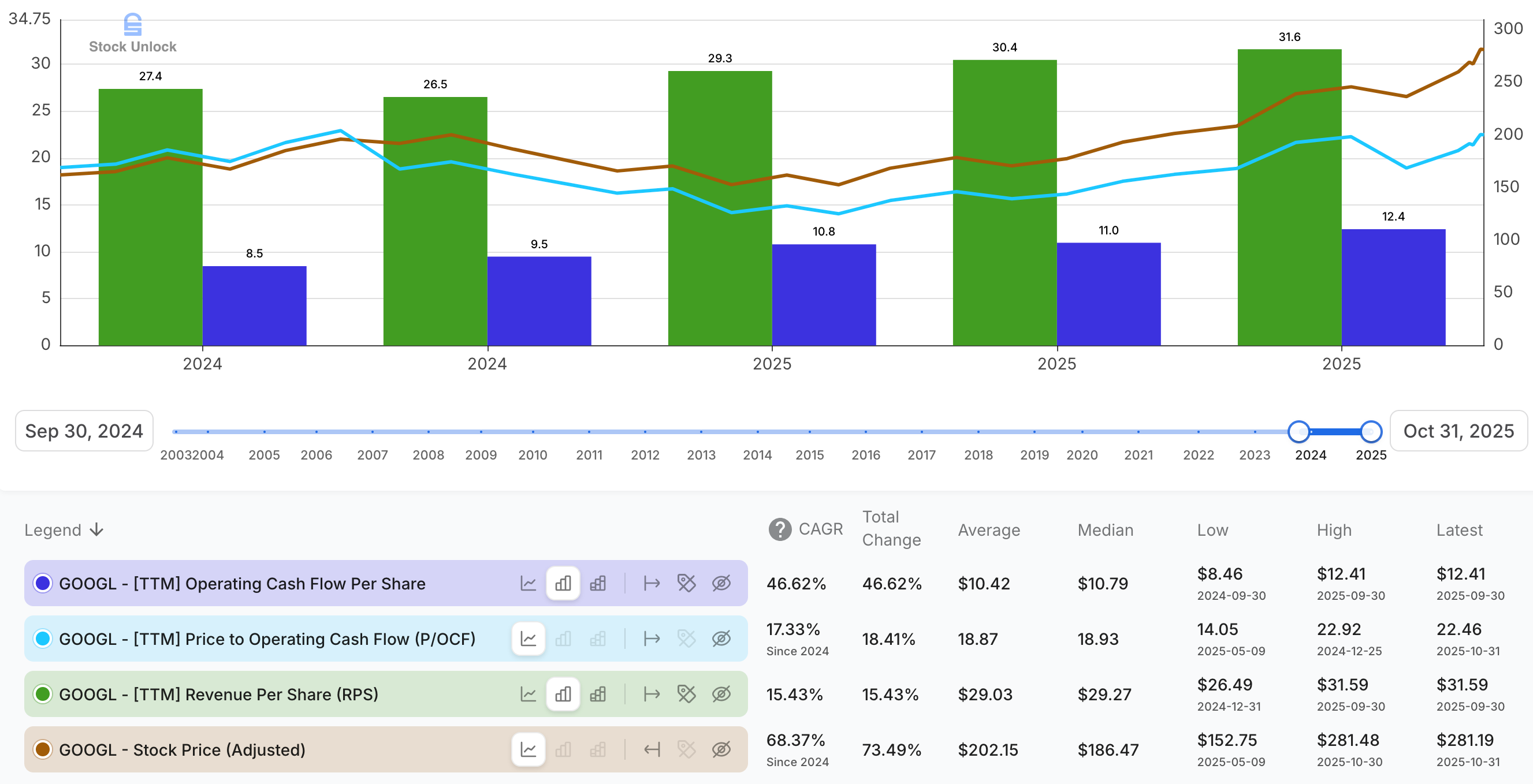 Trailing twelve months (TTM) OCF per share rose from $8.46 (Q3 2024) to $12.41 (latest), +46.62%, while revenue per share climbed to $31.59 (+15.4% YoY). Over the same span, the stock advanced to $281, up ~65% since October 2024. The move from 20x to 22.5x P/OCF wasn’t multiple expansion alone; it came with meaningful OCF/share acceleration as Google widened its AI lead and the CapEx cycle began to monetize.