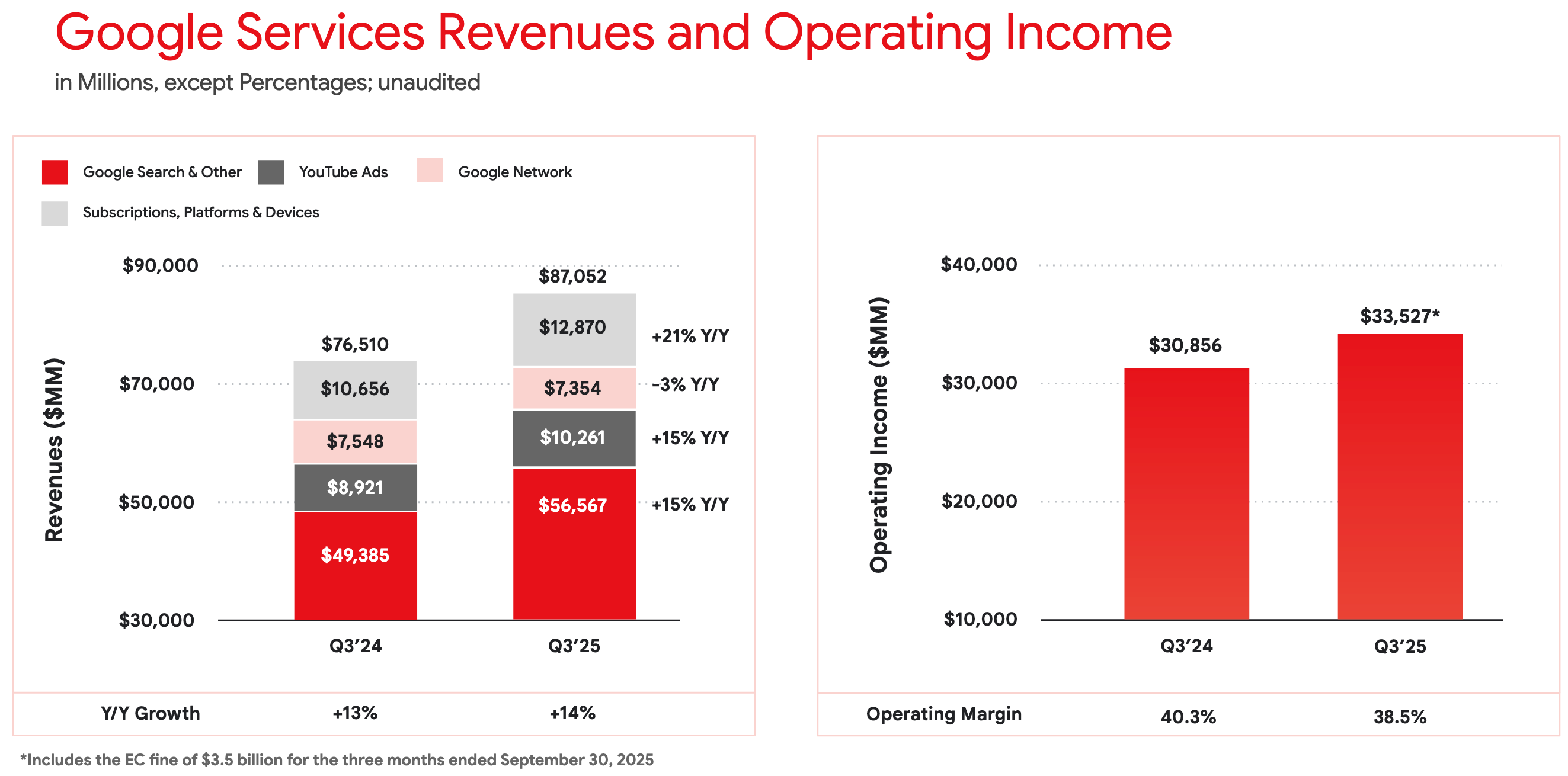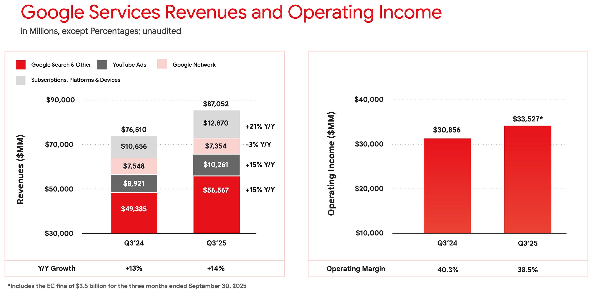 Services operating income was $33.5 billion (+9% YoY) with a 38.5% margin, both dampened by the European Commission (EC) fine; excluding the $3.5 billion EC charge booked in Services, operating income would have been $37 billion and operating margin 42.5%, a +2.2% expansion vs. 40.3% a year ago. These regulatory fines are episodic and largely one-off; for Google (and Big Tech generally) they’ve become a recurring cost of scale, more a periodic “tax on dominance” than a structural impairment to the business model.