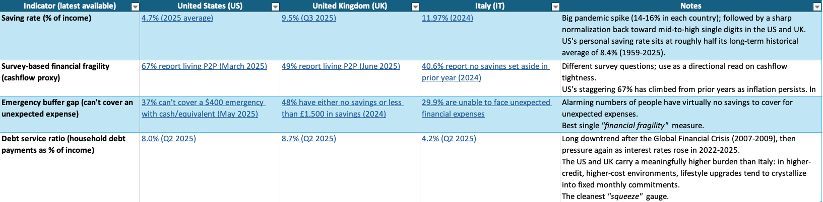 I focus on Italy (where I live), the UK (where I spent 13 years), and the US (where most of my portfolio exposure sits) because they’re familiar to me and because they represent three different mixes of wages, housing costs, welfare support, and consumer credit that shape how easily spending turns into fixed commitments.