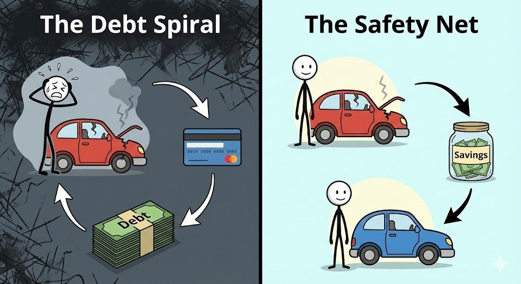 Why slack matters: Saving is the buffer that prevents ordinary problems from becoming financial emergencies. A cash reserve turns a car repair, medical bill, or job gap into a manageable setback, instead of a debt spiral. Investing comes after that foundation. Once an emergency buffer exists, investing is what you do with surplus slack so it can outpace price inflation1 and compound2 over time.