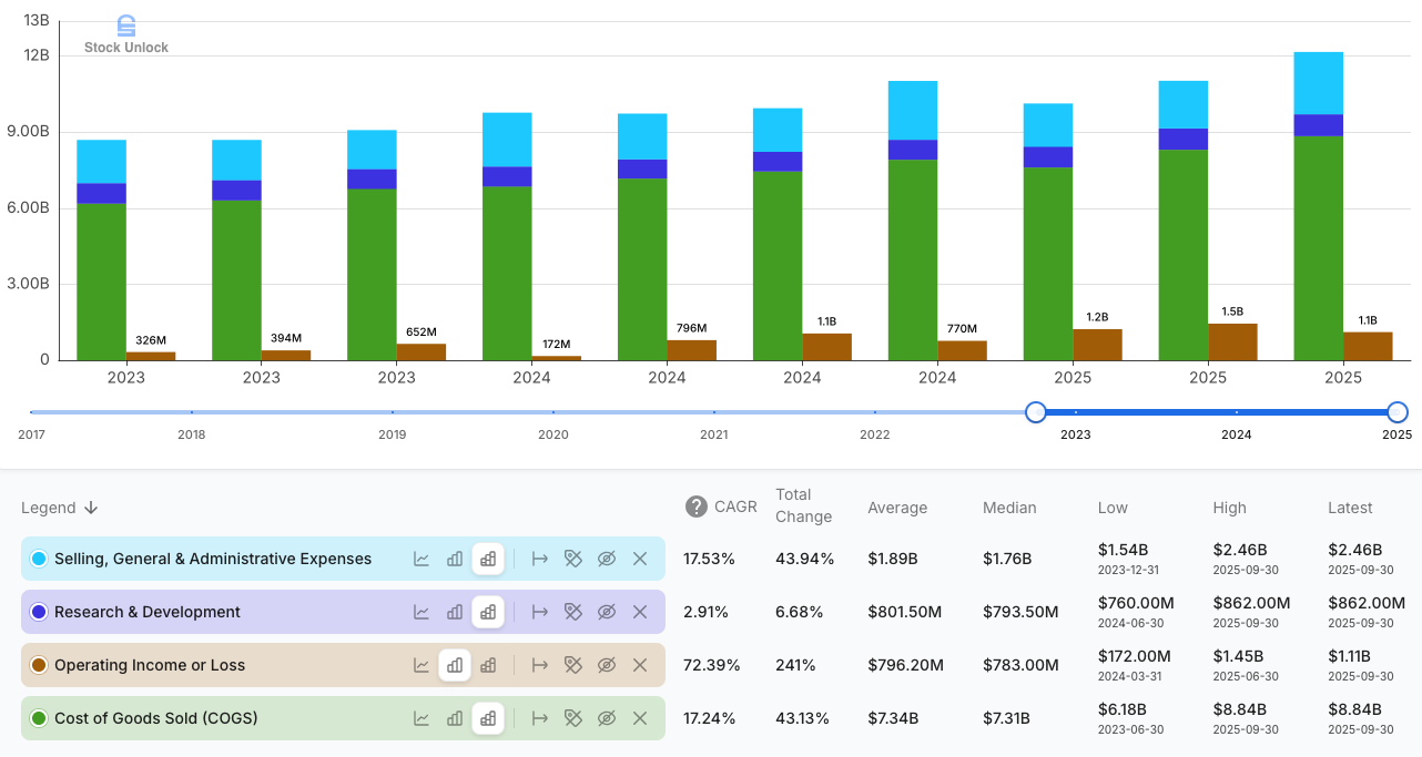 Income from operations (EBIT) increased to $1.1 billion (+4.7% YoY). In isolation that looks like steady, unspectacular growth; in context, it’s strong evidence of operating leverage. Since Uber first turned sustainably profitable at the operating line in mid-2023, operating income has compounded 72.4% yearly from $326 million to over $1 billion per quarter, growing faster than revenue over this period. That progression shows Uber adding incremental Gross Bookings and revenue without a proportional increase in Cost of Goods Sold (COGS) and operating expenses. In other words, a larger share of each new dollar flowing through the platform is dropping to the operating line.