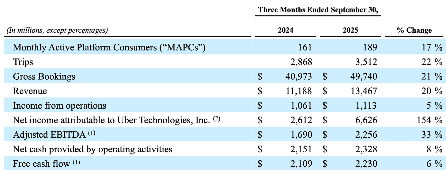 Q3 shows this idea playing out in practice. The business is compounding scale and engagement not by pushing price, but by making the platform more useful, more integrated, and more affordable. CEO Dara Khosrowshahi captured this shift in tone and posture in the earnings press release: