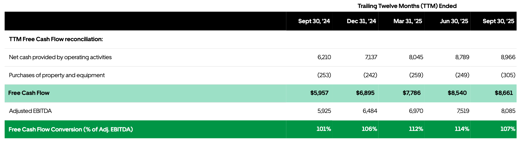 “On a trailing twelve month basis, we generated a record $8.7 billion of free cash flow […] As a reminder, FCF conversion can fluctuate on a quarterly basis due to working capital seasonality and the timing of cash payments, and we encourage investors to evaluate our FCF on an annual basis.”