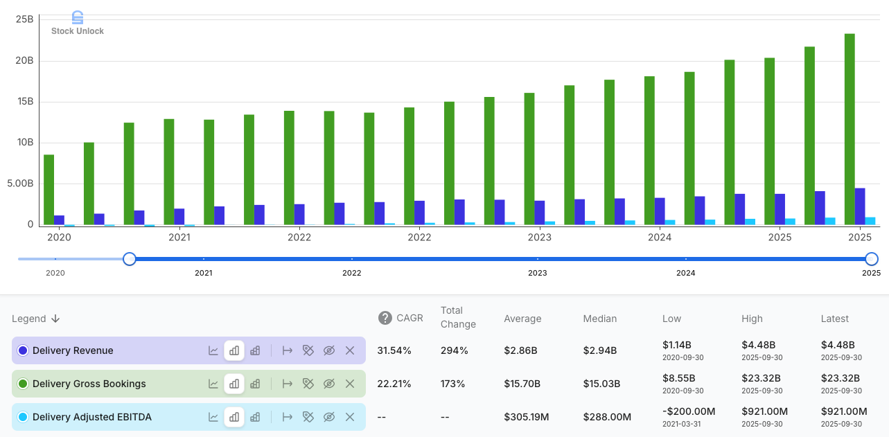 In Q3 2025, Delivery Gross Bookings grew 25% to $23.3 billion, and Delivery revenue grew 29% to $4.5 billion. The gap between Gross Bookings growth and revenue growth is important: it reflects not only volume, but also better monetization. The five-year trend reinforces this: Delivery Gross Bookings have climbed from $8.6 billion to over $23 billion, while Delivery revenue has nearly quadrupled, compounding at about 31.5% vs. 22.2% for Gross Bookings. That spread, together with the shift from losses to solid positive adjusted EBITDA, is a clear sign of improving take rates and structurally stronger monetization.