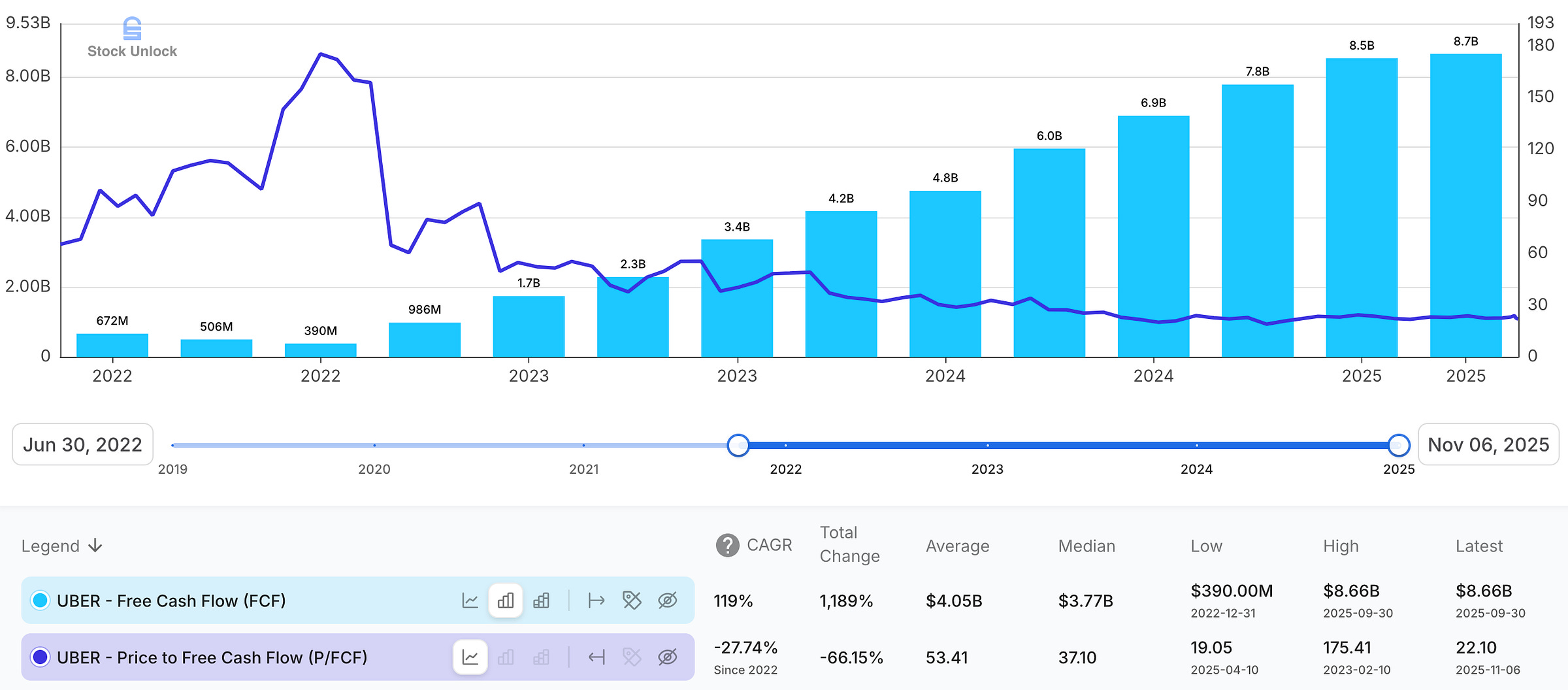 To frame it numerically (directionally, not precisely), I start with $8.66 billion of TTM FCF. Management guides to a “mid-to-high teens” Gross Bookings CAGR and is “targeting adjusted EBITDA growth at more than 2x Gross Bookings growth”, which implies roughly 30-40% growth in their profitability proxy. If Uber were to sustain its current 100%+ FCF conversion on adjusted EBITDA, that framework could support ~32-43% FCF CAGR.